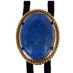 The Lapis Lazuli Rope Edge Bolo Tie features a Lapis Lazuli cabochon measuring 30x22mm (or 1 1/4" by 7/8"). Lapis Lazuli had rich blue coloring with a whitish or yellowish matrix or feathering. The stone is set in a 4-prong setting with a rope edge in your choice of gold or silver. The setting measu...